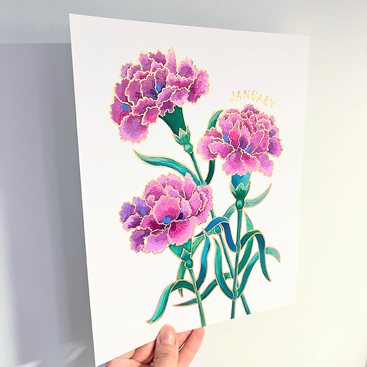 One of January's birth flowers, carnations represent love and affection and are captured beautifully in this hand-embellished print. Gift it to a loved one to celebrate a birthday, new baby, Mother's Day, etc. — or form your own family bouquet with a print for each member of your family.