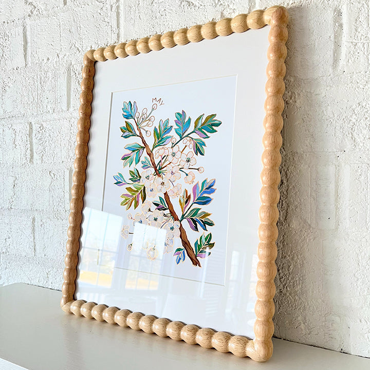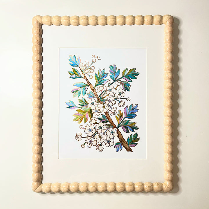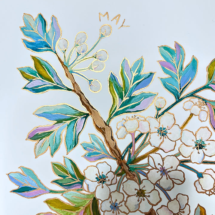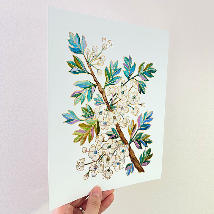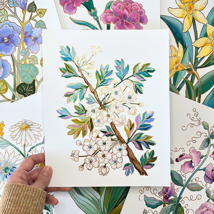 One of May's birth flowers, hawthorns represent protection and love and are captured beautifully in this hand-embellished print. Gift it to a loved one to celebrate a birthday, new baby, Mother's Day, etc. — or form your own family bouquet with a print for each member of your family.