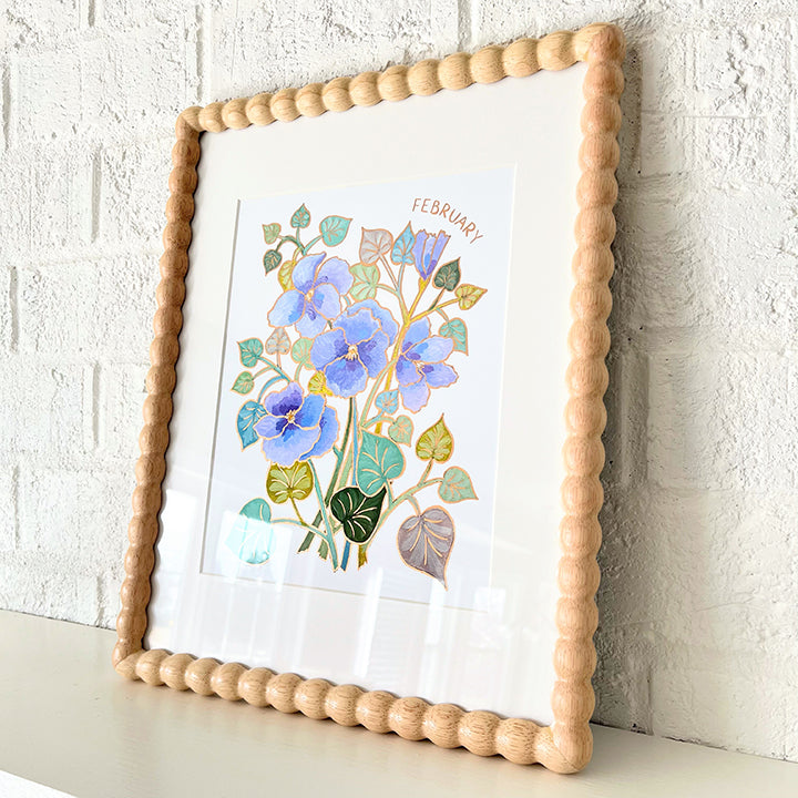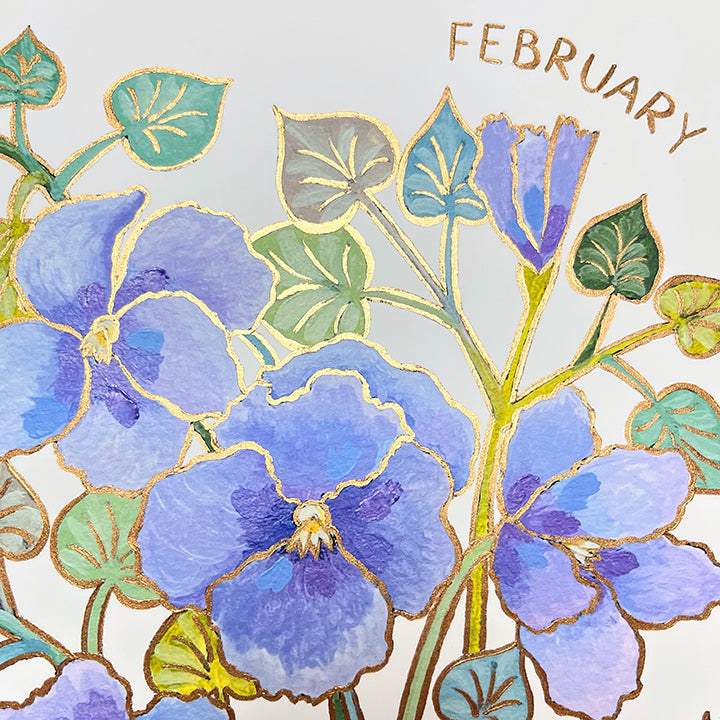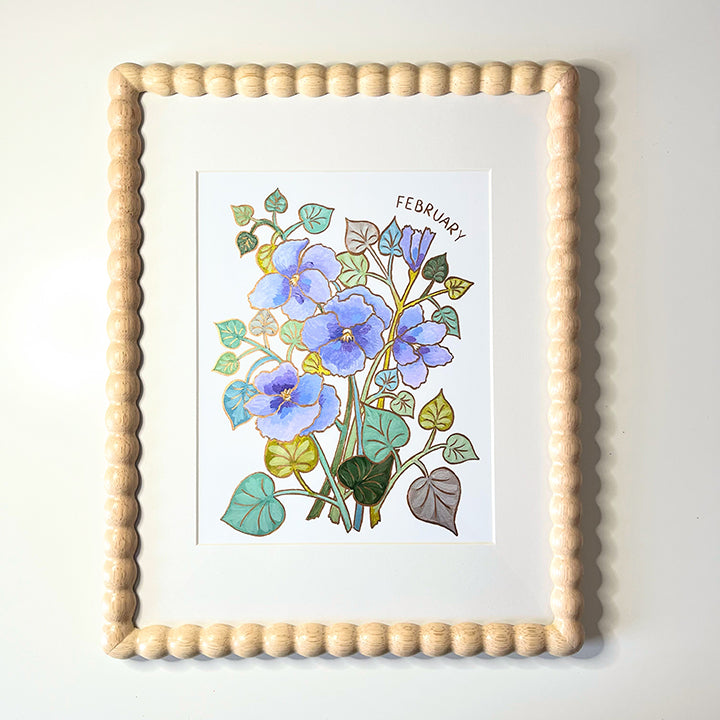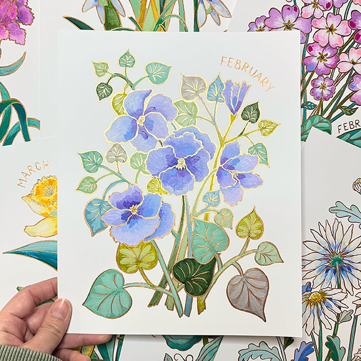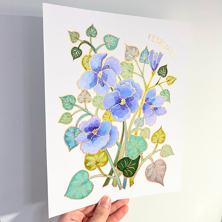 One of February's birth flowers, violets represent loyalty and devotion and are captured beautifully in this hand-embellished print. Gift it to a loved one to celebrate a birthday, new baby, Mother's Day, etc. — or form your own family bouquet with a print for each member of your family.