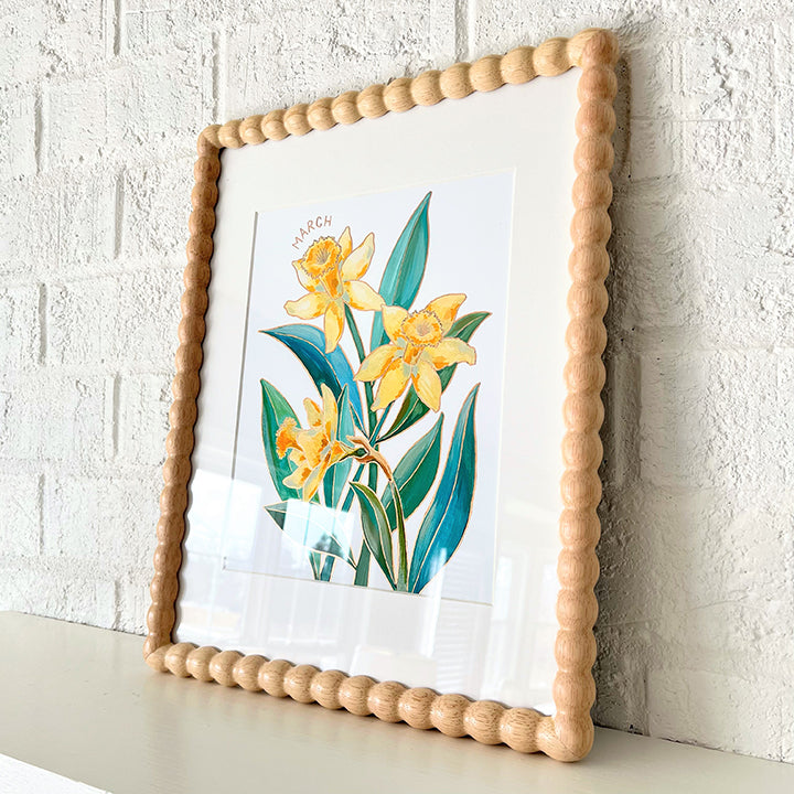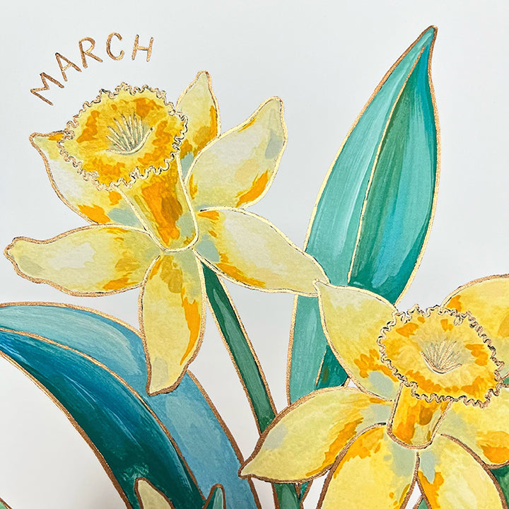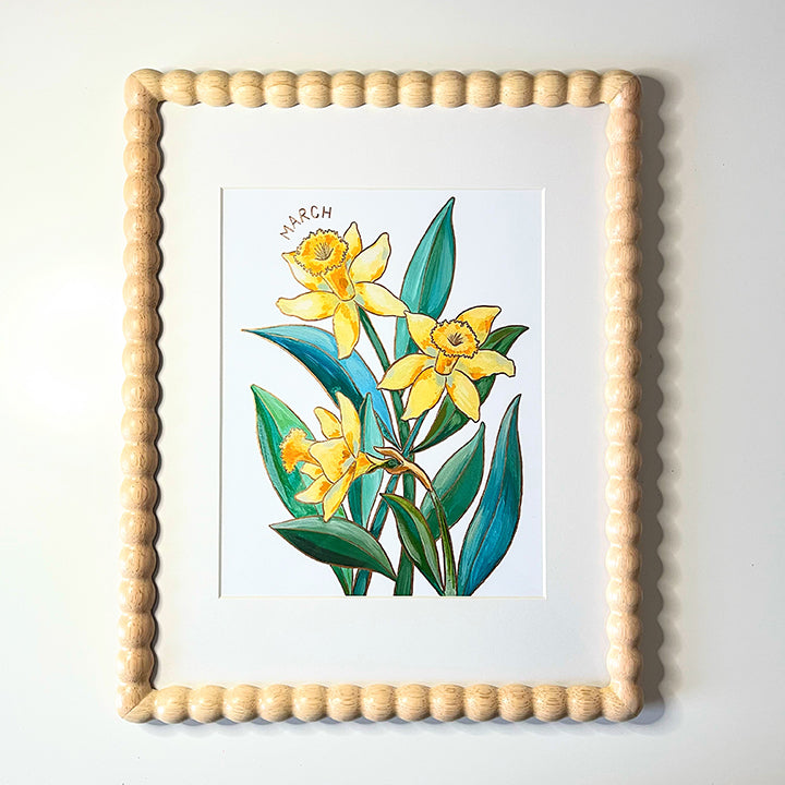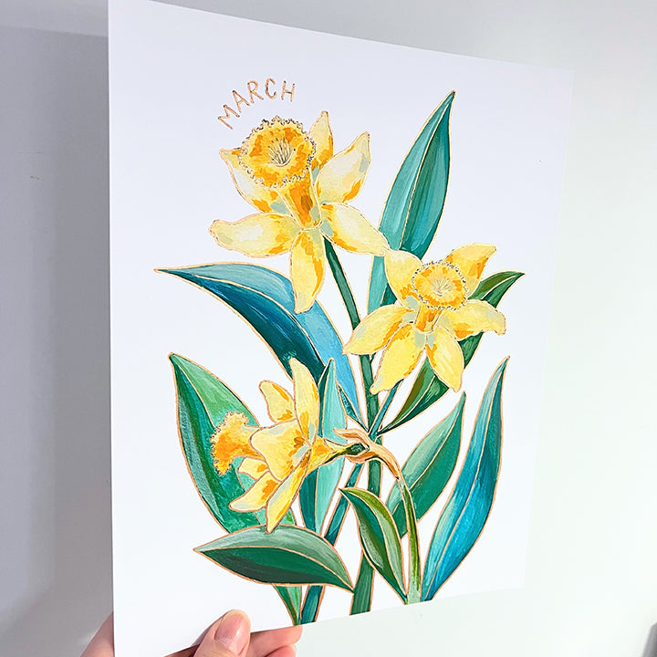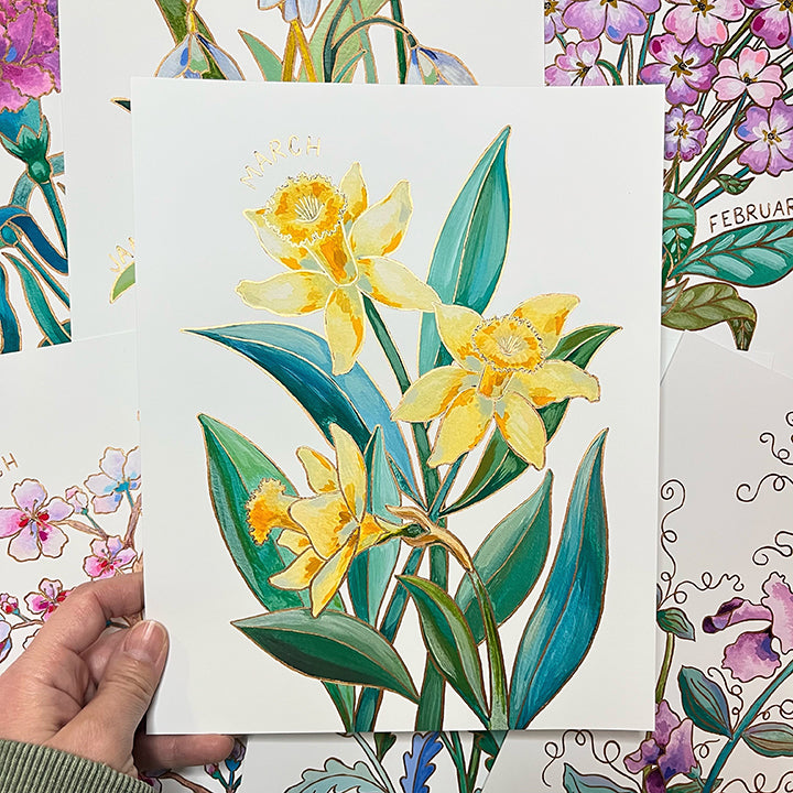 One of March's birth flowers, daffodils represent hope and new beginnings and are captured beautifully in this hand-embellished print. Gift it to a loved one to celebrate a birthday, new baby, Mother's Day, etc. — or form your own family bouquet with a print for each member of your family.