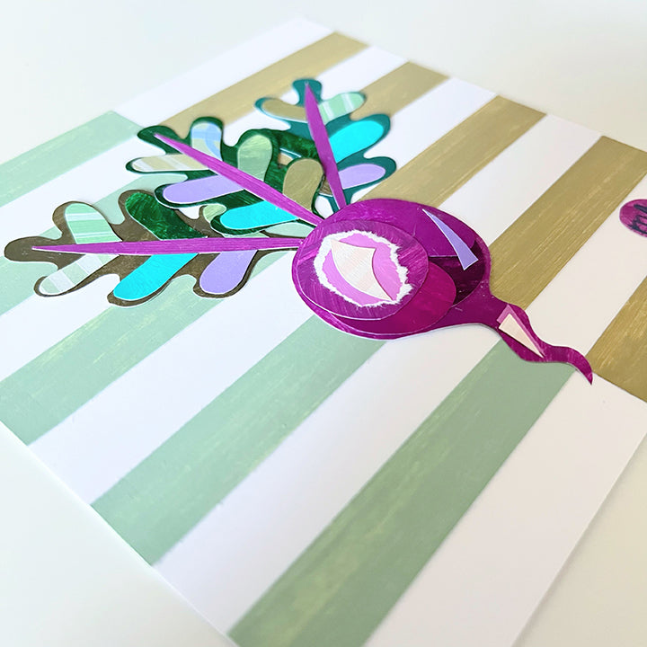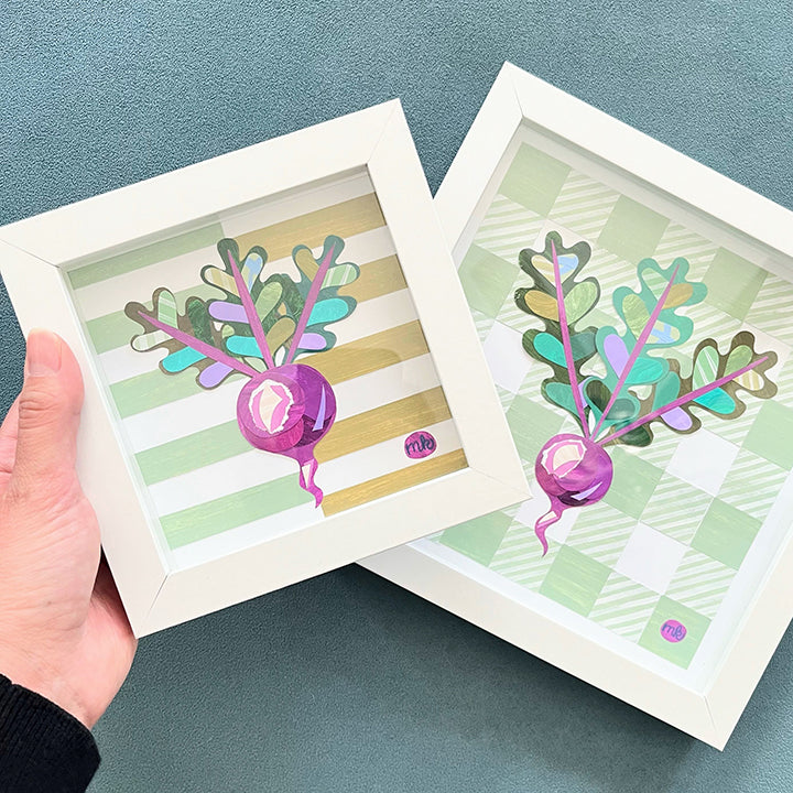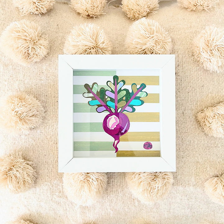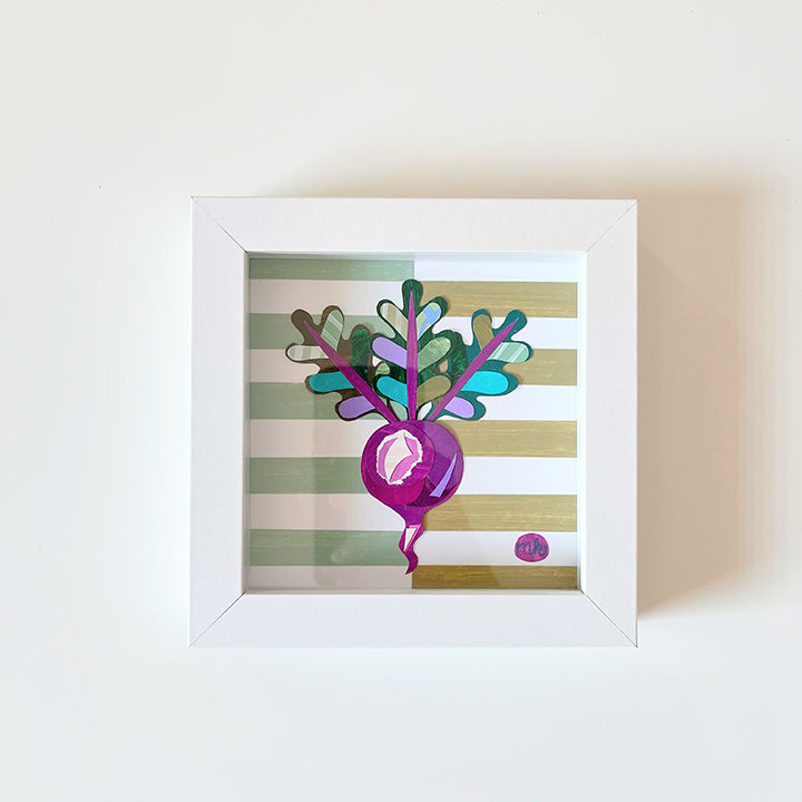 Original hand-painted, hand-cut mini collage affixed to a premium matte paper and placed in a white shadowbox frame.