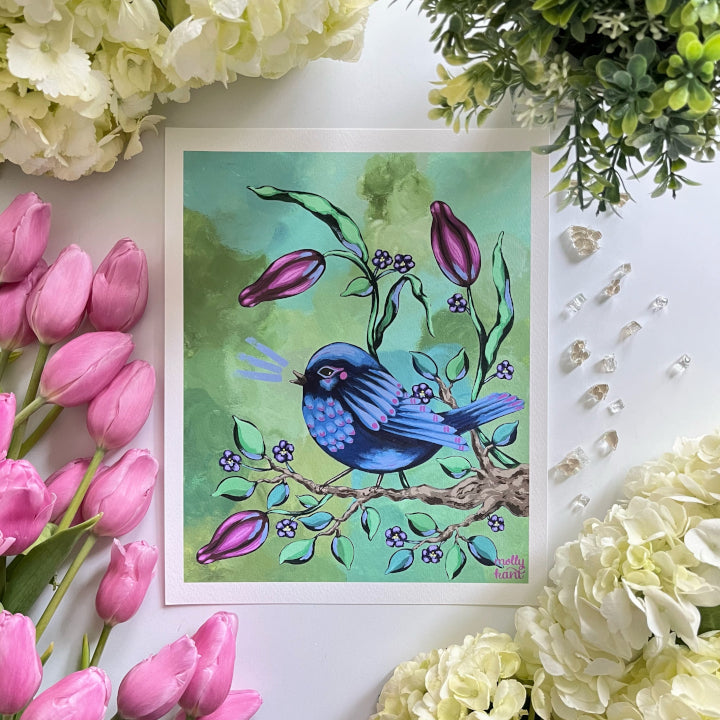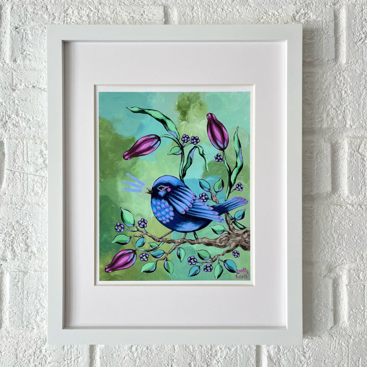Add beauty and charm to any space in your home with this colorful print featuring a singing bird amidst a lush springtime scene.