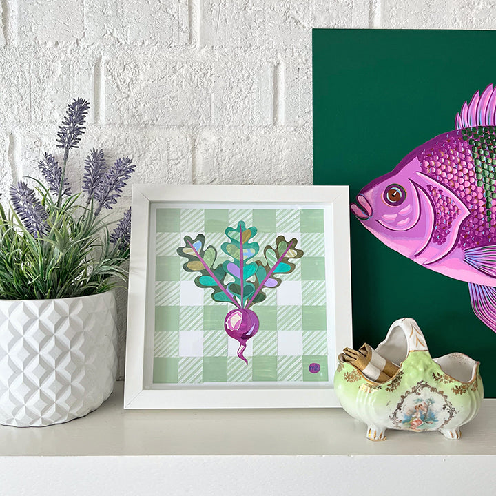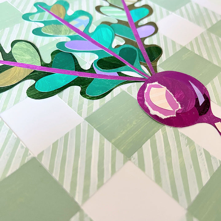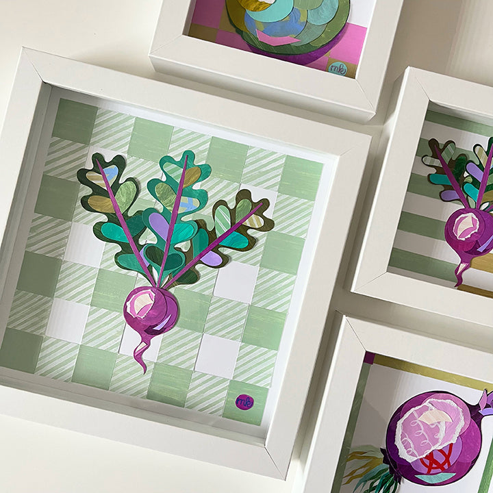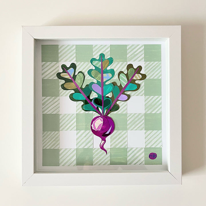 Original hand-painted, hand-cut collage affixed to a premium matte paper and placed in a white shadowbox frame.