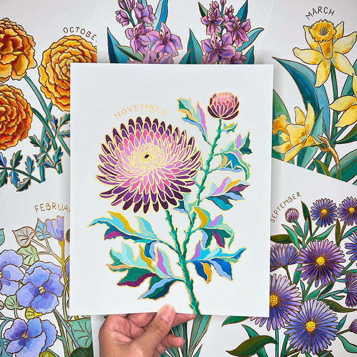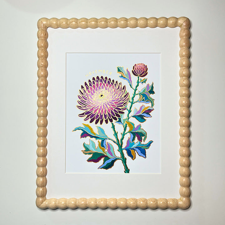 One of November's birth flowers, the chrysanthemum represents optimism and joy and is captured beautifully in this hand-embellished print. Gift it to a loved one to celebrate a birthday, new baby, Mother’s Day, etc. — or form your own family bouquet with a unique print for each member of your family.