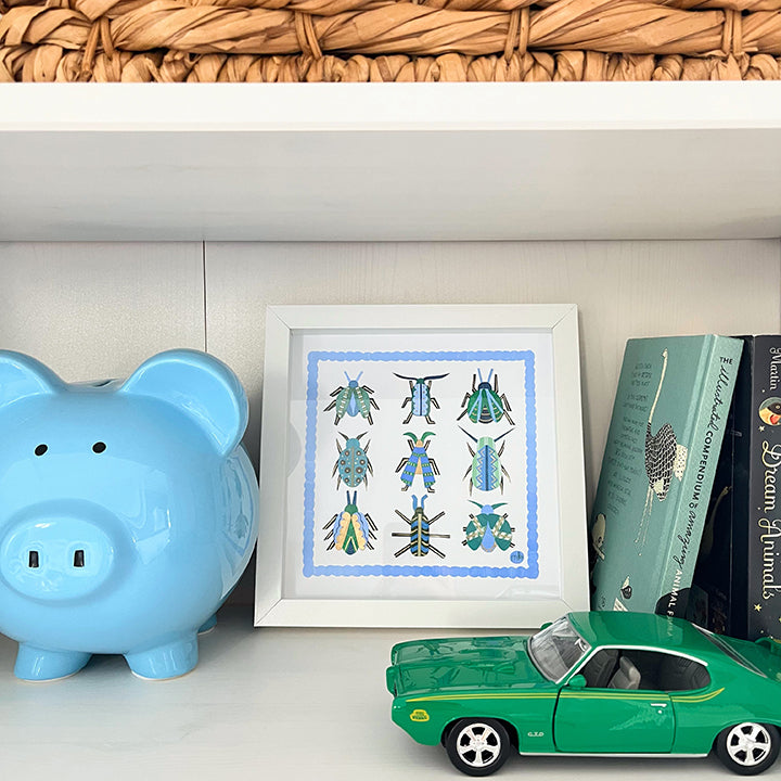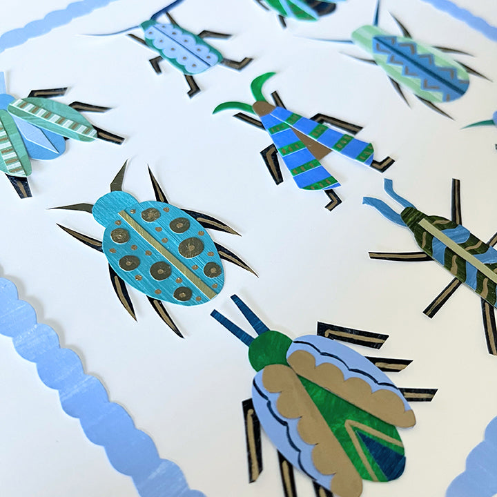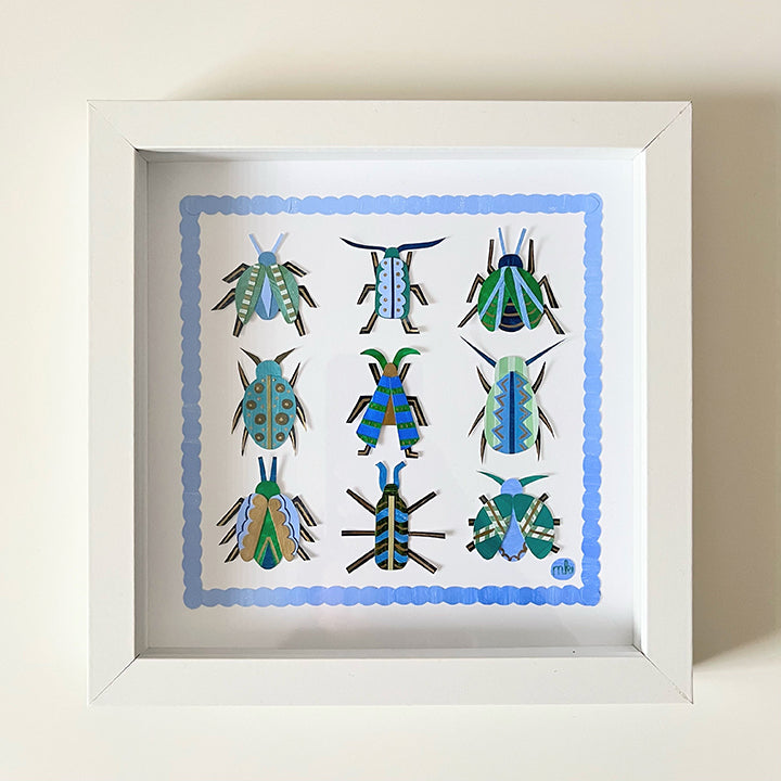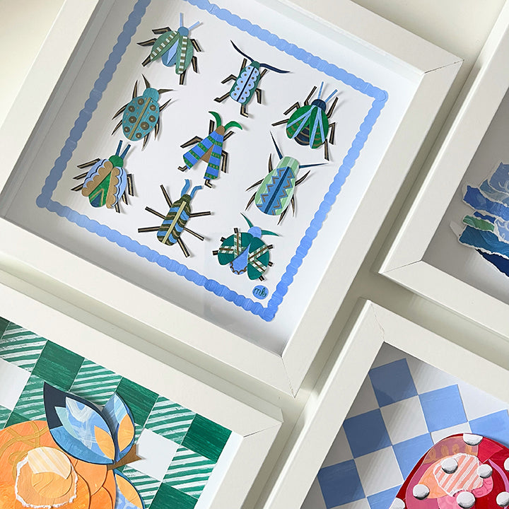 Original hand-painted, hand-cut collage affixed to a premium matte paper and placed in a white shadowbox frame.