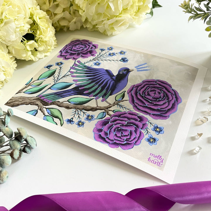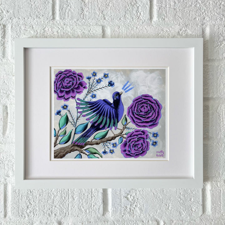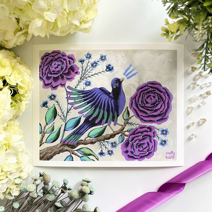 Add beauty and charm to any space in your home with this colorful print featuring a singing bird amidst a lush springtime scene.