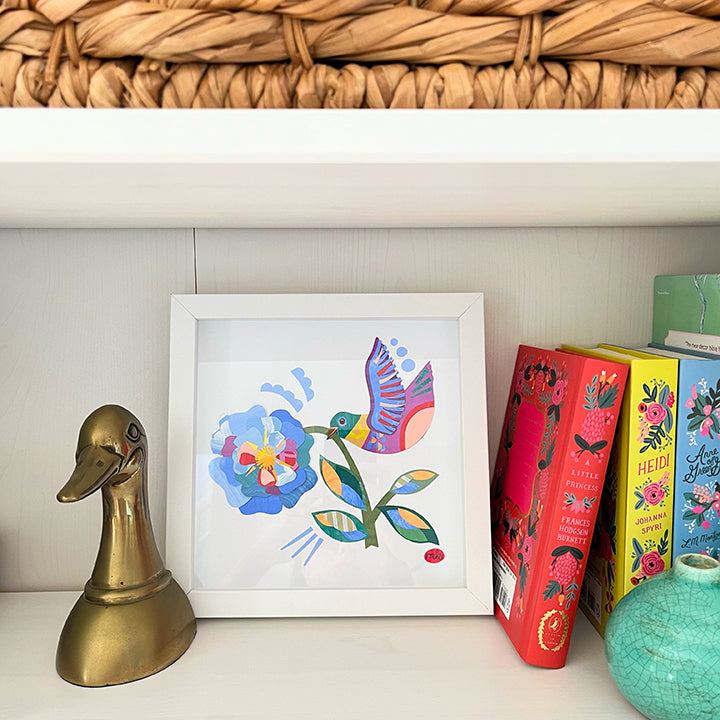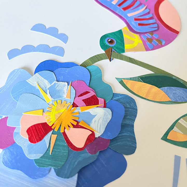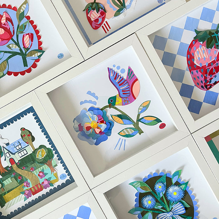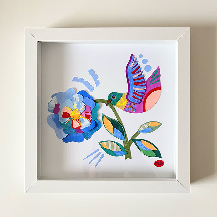 Original hand-painted, hand-cut collage affixed to a premium matte paper and placed in a white shadowbox frame.