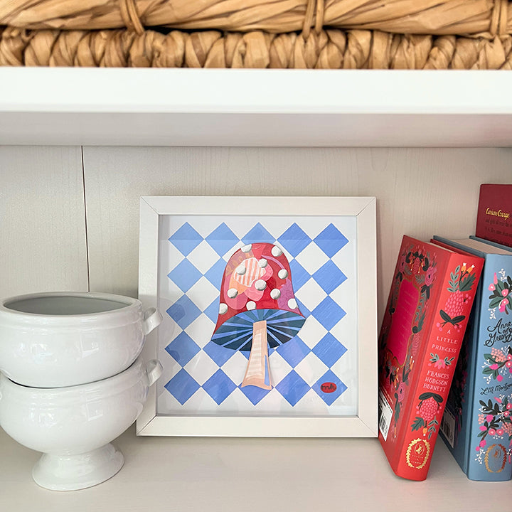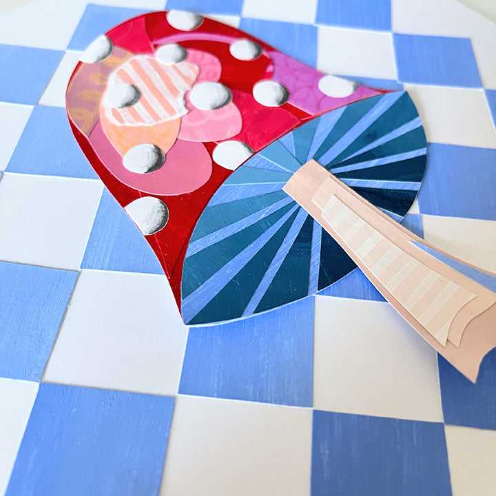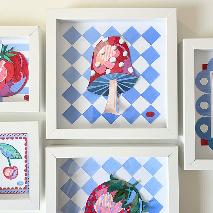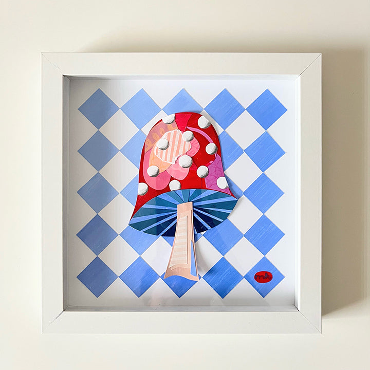 Original hand-painted, hand-cut collage affixed to a premium matte paper and placed in a white shadowbox frame.