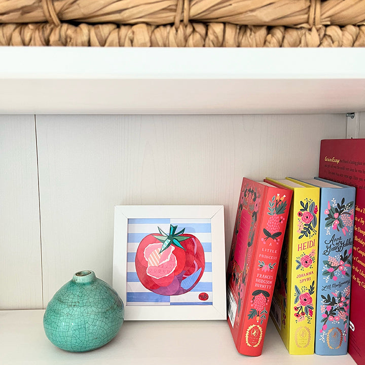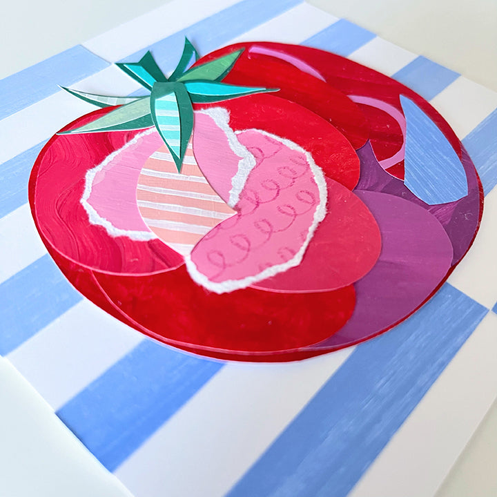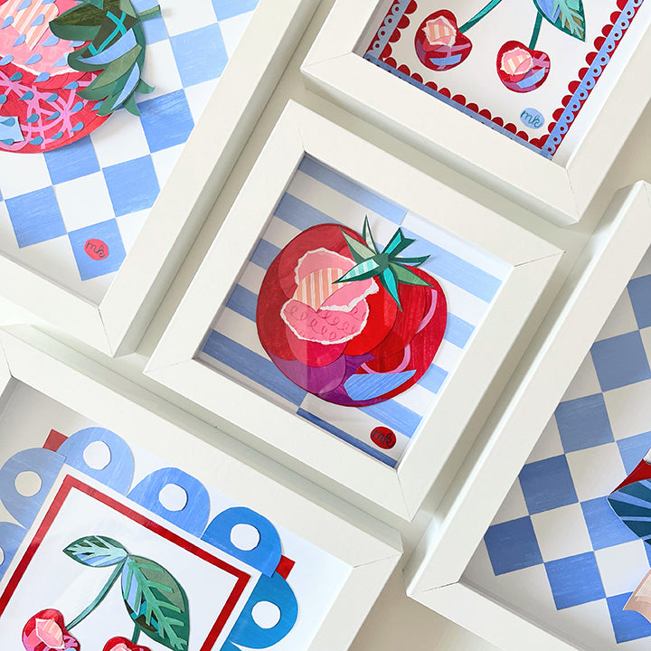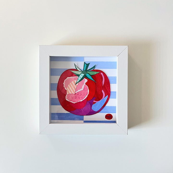 Original hand-painted, hand-cut mini collage affixed to a premium matte paper and placed in a white shadowbox frame.