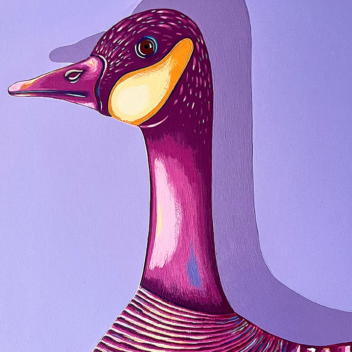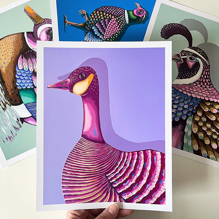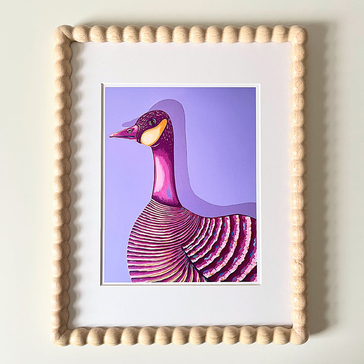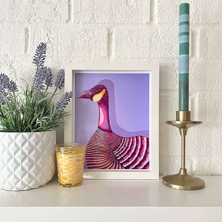 Bring a touch of whimsy and personality to your space with this high-quality art print featuring a colorful goose — perfect for a nursery, play space, bathroom, and more.