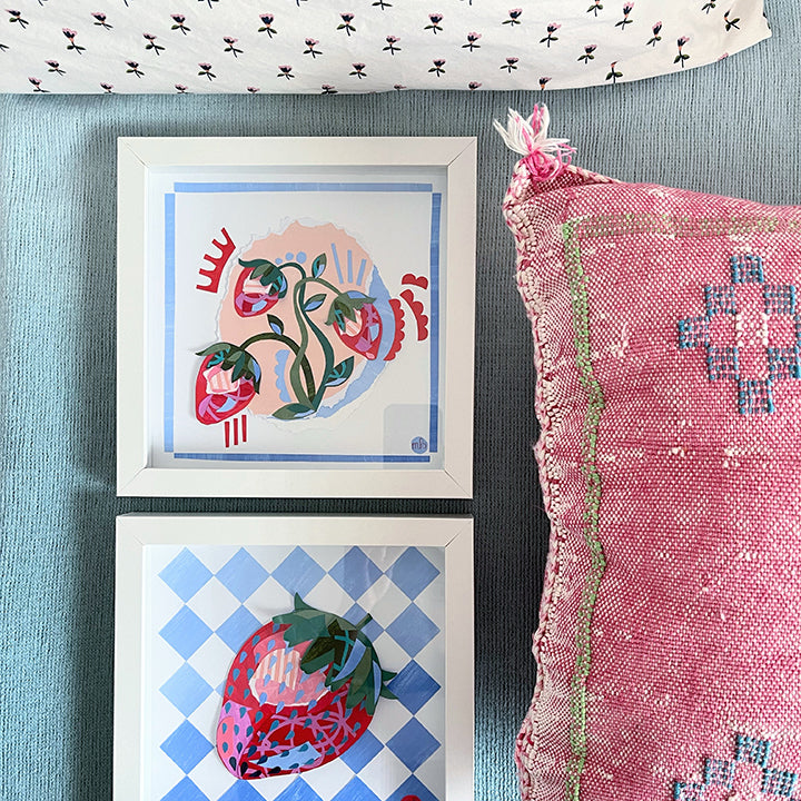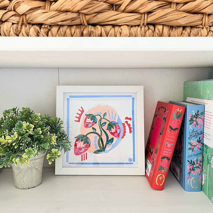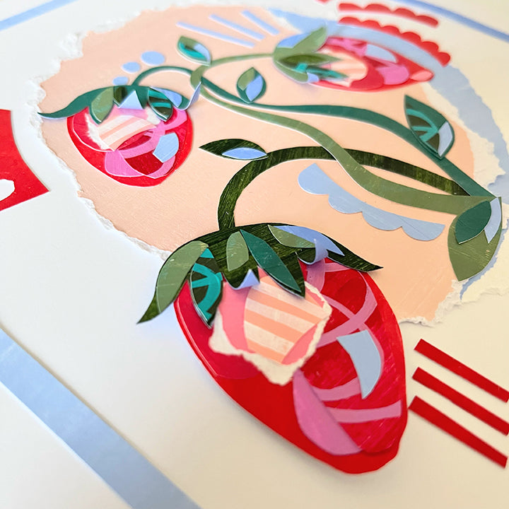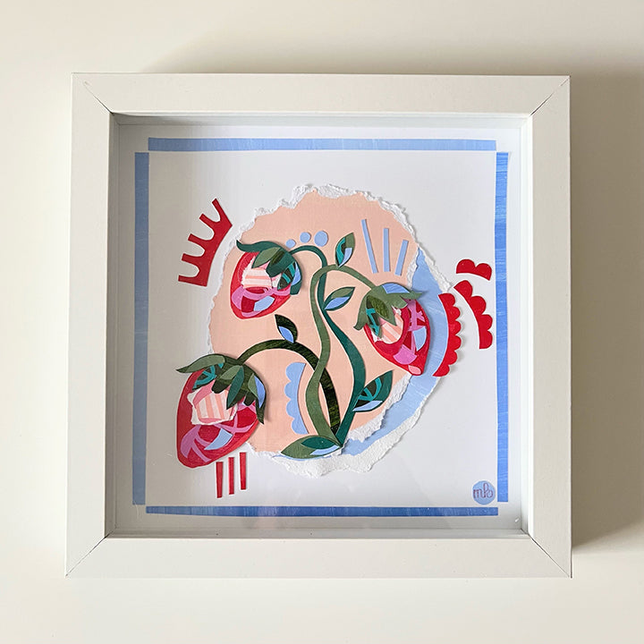 Original hand-painted, hand-cut collage affixed to a premium matte paper and placed in a white shadowbox frame.