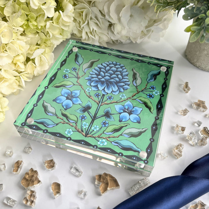 Framed artwork does not come with any styling accessories shown here. (Acrylic blocks are not equipped with a hanging mechanism — for tabletop display only.)