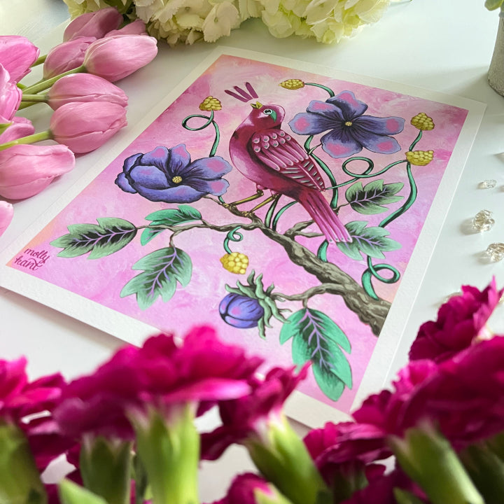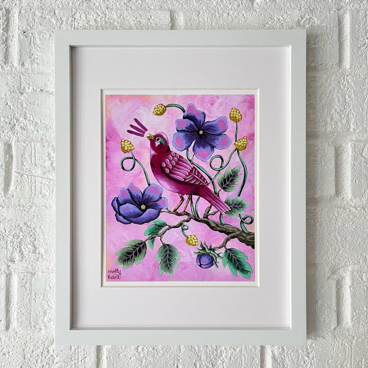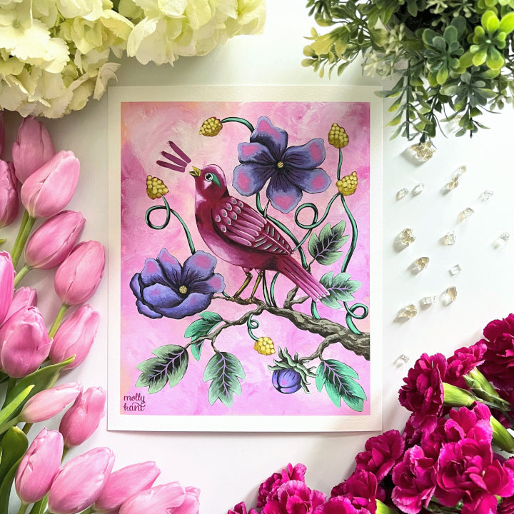 Add beauty and charm to any space in your home with this colorful print featuring a singing bird amidst a lush springtime scene.