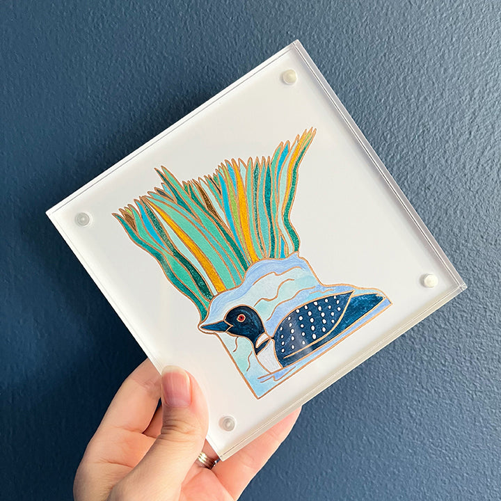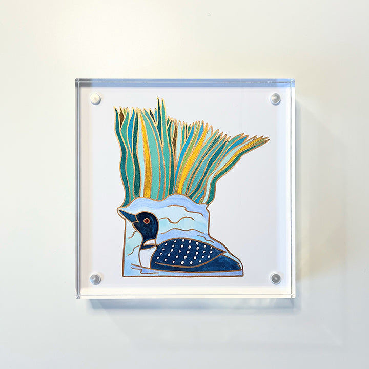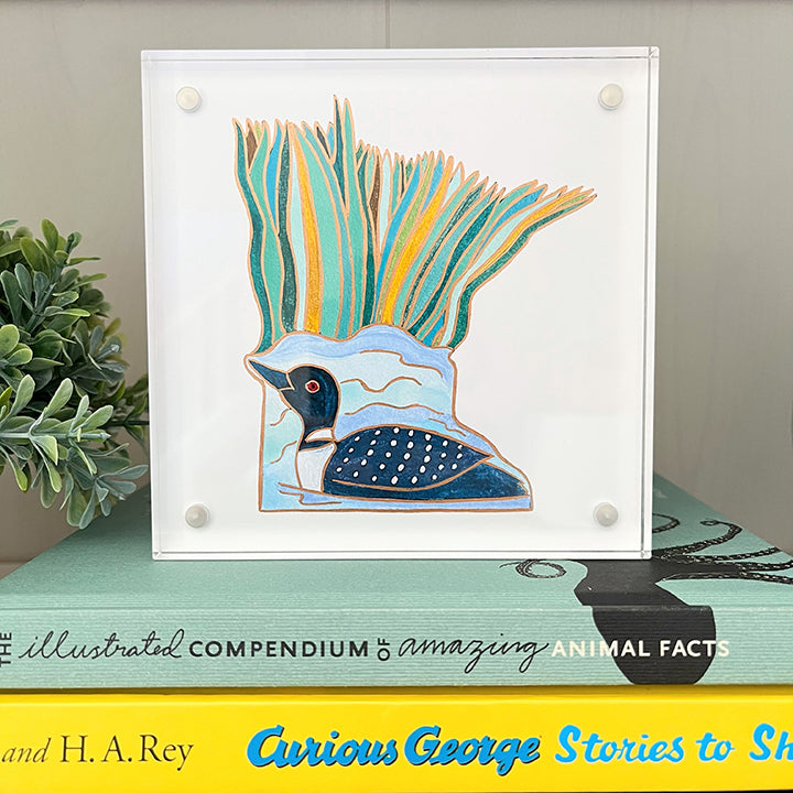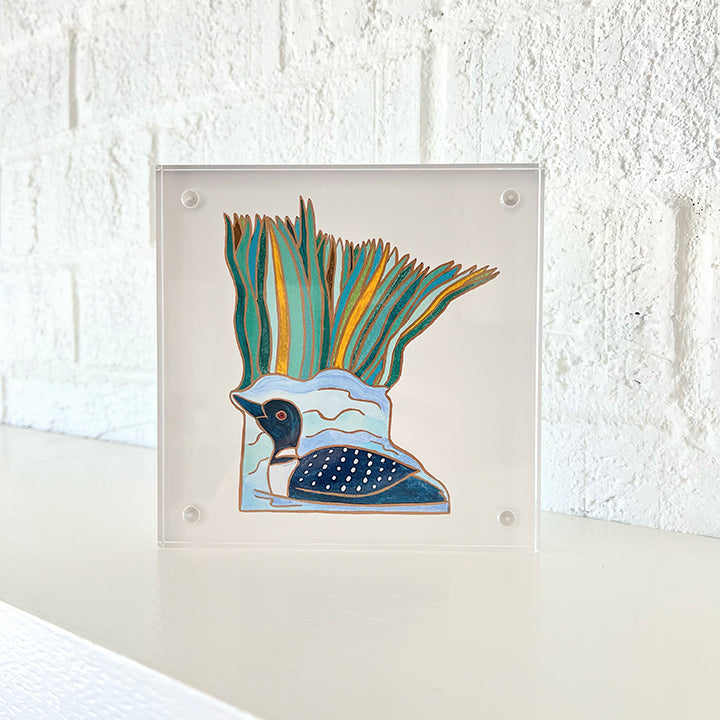 Show your Minnesota pride with this hand-embellished art print framed in an acrylic block! Featuring a Minnesota motif comprised of the state bird — a loon — this piece will bring a perfect pop of whimsy and personality to your space.