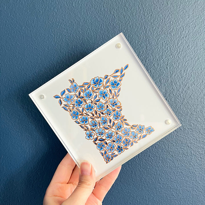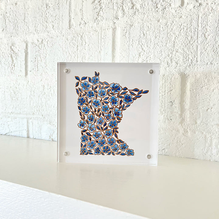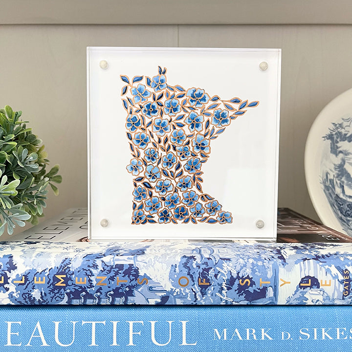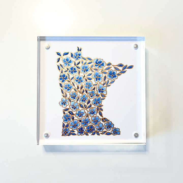 Show your Minnesota pride with this hand-embellished art print framed in an acrylic block! Featuring a Minnesota floral motif inspired by Scandinavian colors and designs, this piece will bring a perfect pop of whimsy and personality to your space.