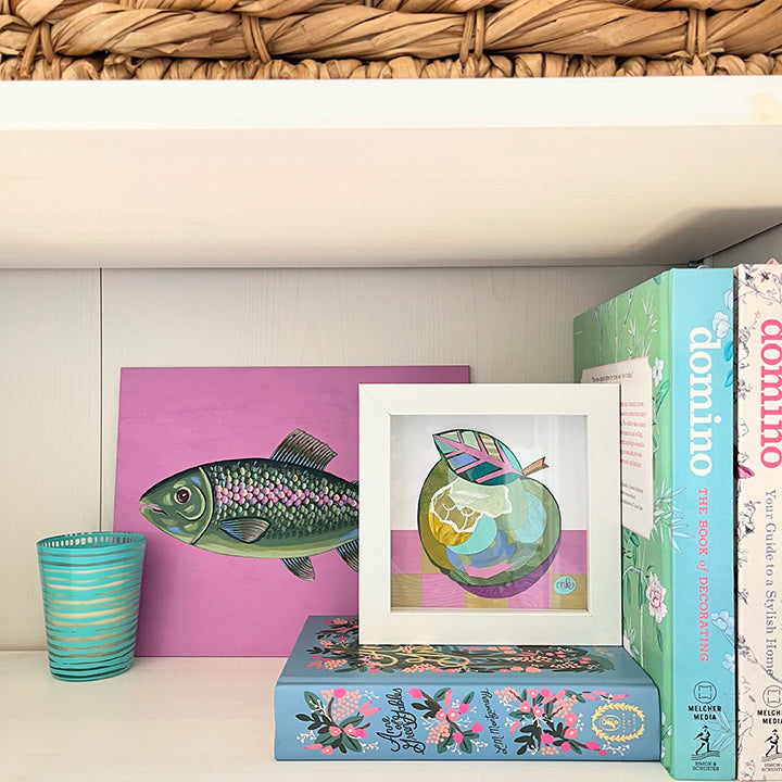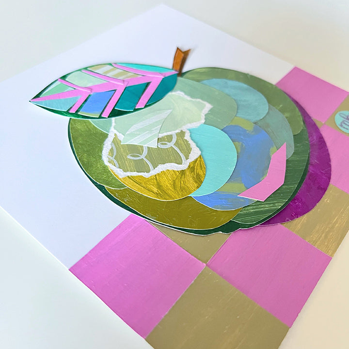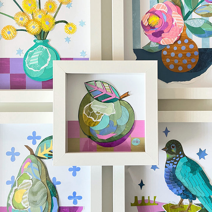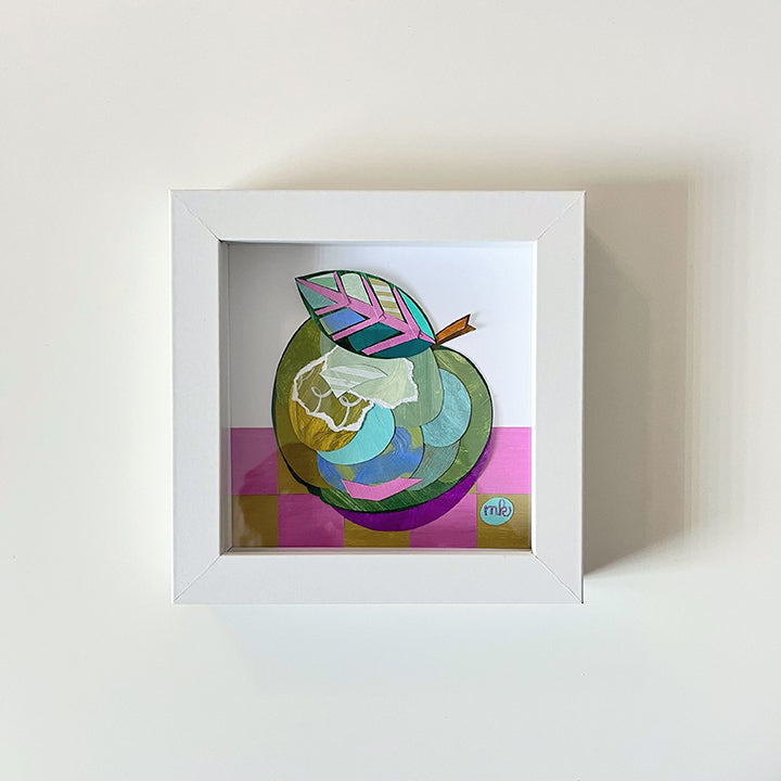 Original hand-painted, hand-cut mini collage affixed to a premium matte paper and placed in a white shadowbox frame.