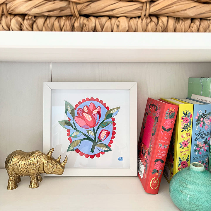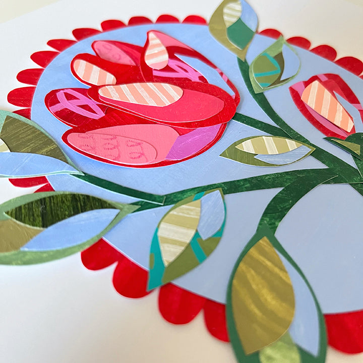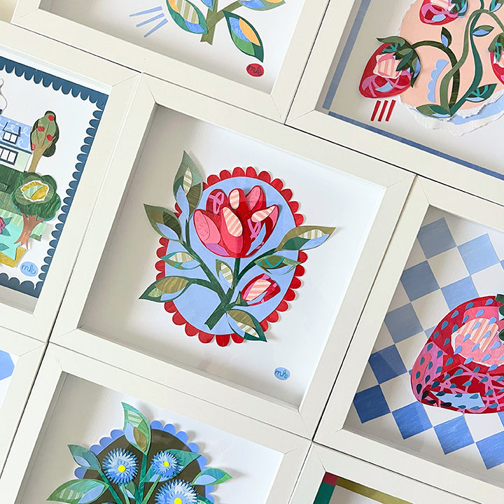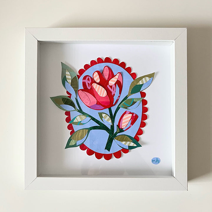 Original hand-painted, hand-cut collage affixed to a premium matte paper and placed in a white shadowbox frame.
