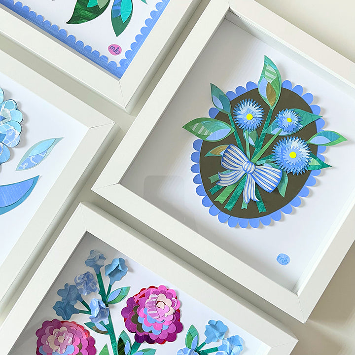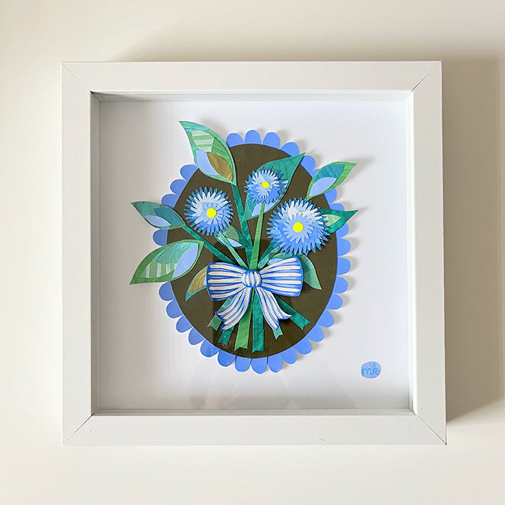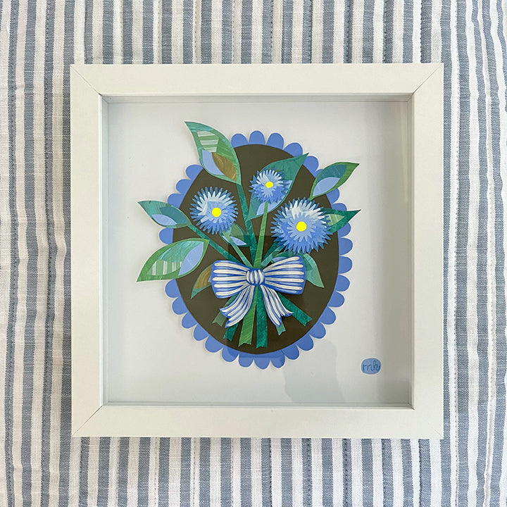 Original hand-painted, hand-cut collage affixed to a premium matte paper and placed in a white shadowbox frame.