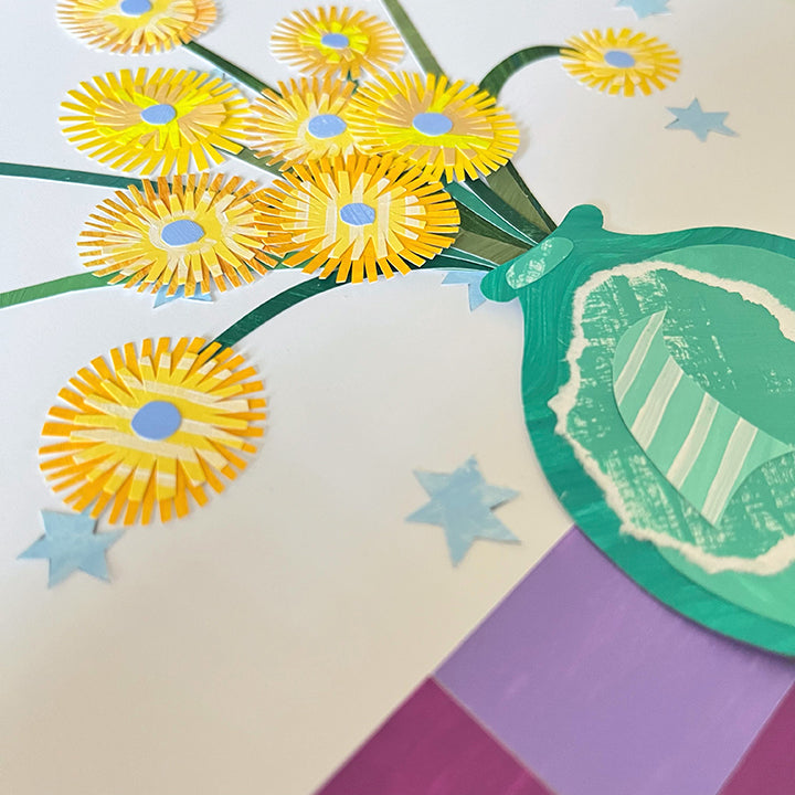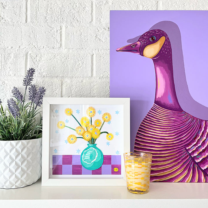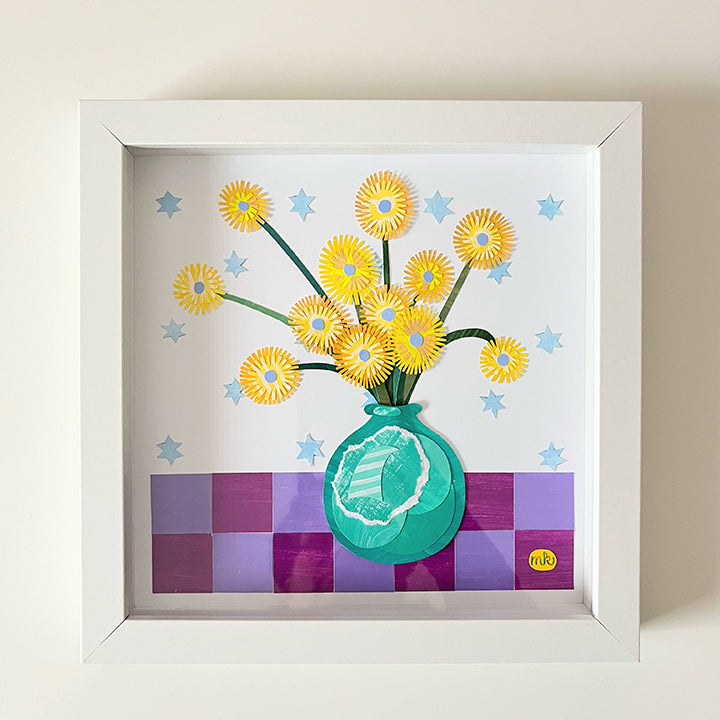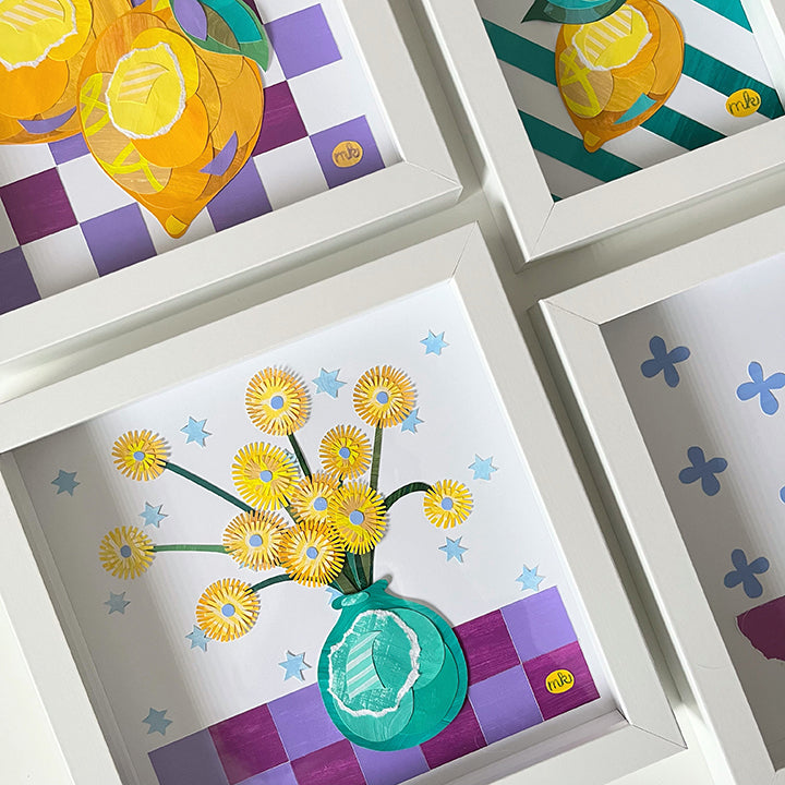 Original hand-painted, hand-cut collage affixed to a premium matte paper and placed in a white shadowbox frame.