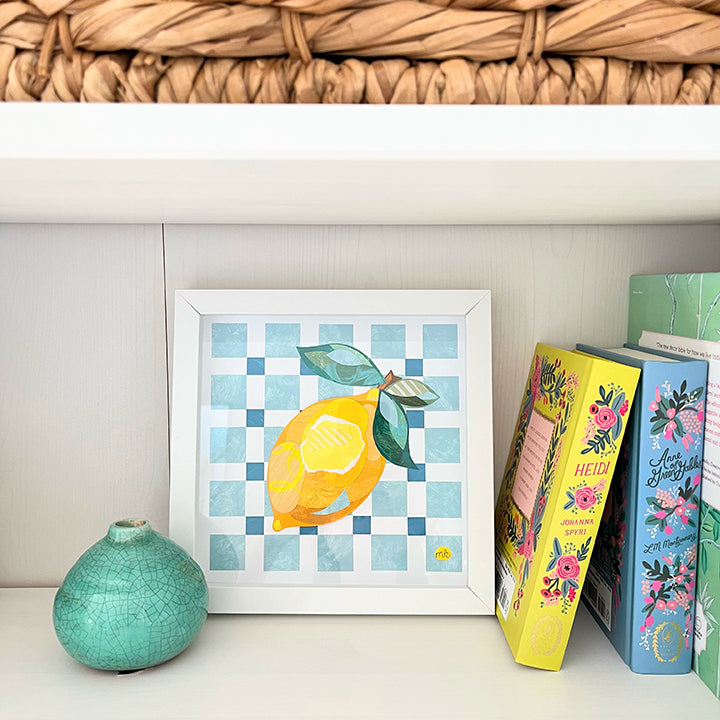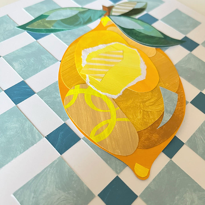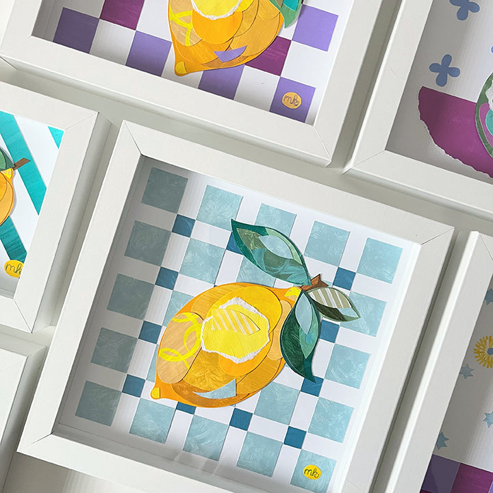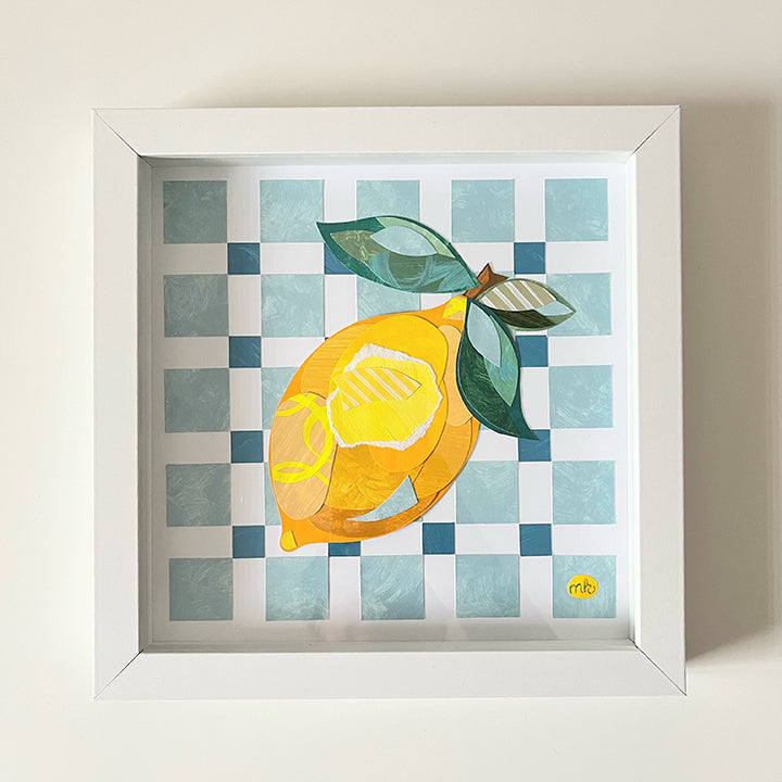 Original hand-painted, hand-cut collage affixed to a premium matte paper and placed in a white shadowbox frame.