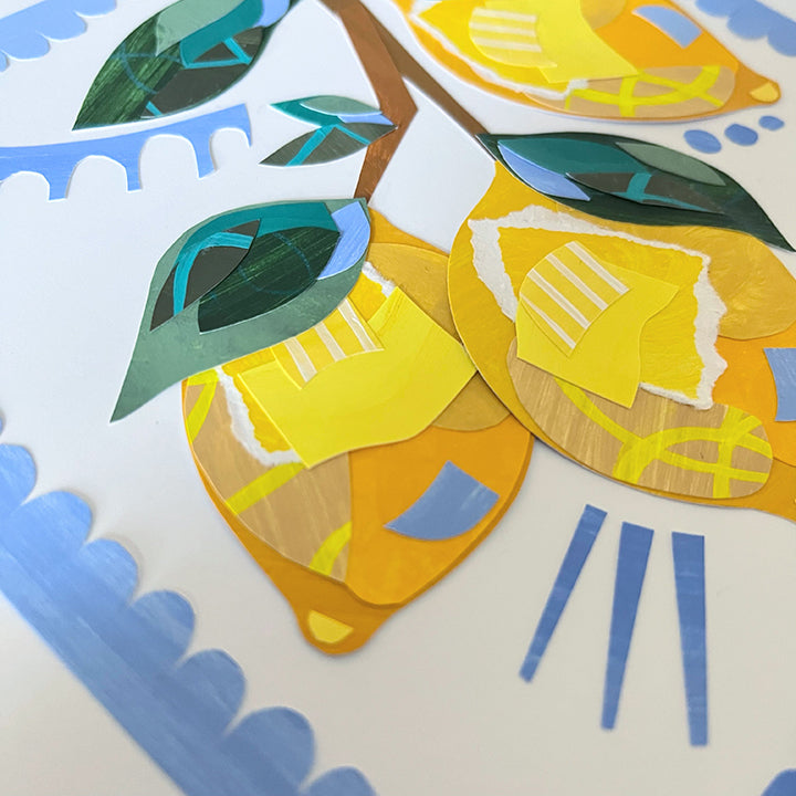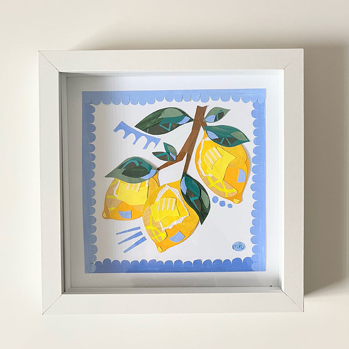 Original hand-painted, hand-cut collage affixed to a premium matte paper and placed in a white shadowbox frame.